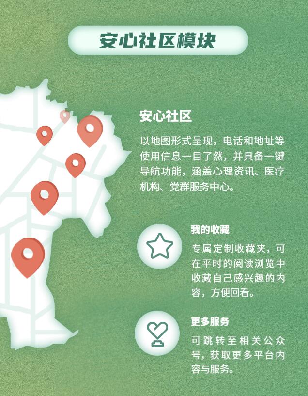 「校園安心行動」線上服務平台突出以下幾個特點:一是資源豐富,彙集市安心行動、區教育、衛生、群團等心理服務資源,實現宣教、諮詢、干預、診療一站式便民服務;二是建立「四位一體」幫扶網絡,通過安心校園、安心家園、安心社區的多維架構,搭建涵蓋家庭、學校、社區、社會組織等在內的幫扶網絡,提升全社會共同關注青少年心理健康的意識;三是實現「碼上服務」,平台實時更新心理相關資訊,用戶還可跳轉至區黨群服務中心、區教育局、區衛生健康局、區婦聯的微信公眾號,獲取更多內容與服務,方便快捷,流程更優化;四是增加「交互功能」,在「我的」板塊,用戶可在平時的閱讀瀏覽中收藏自己感興趣的內容及距離較近的心理諮詢點或診療點,方便用戶高效查找所需內容,提升用戶使用體驗。