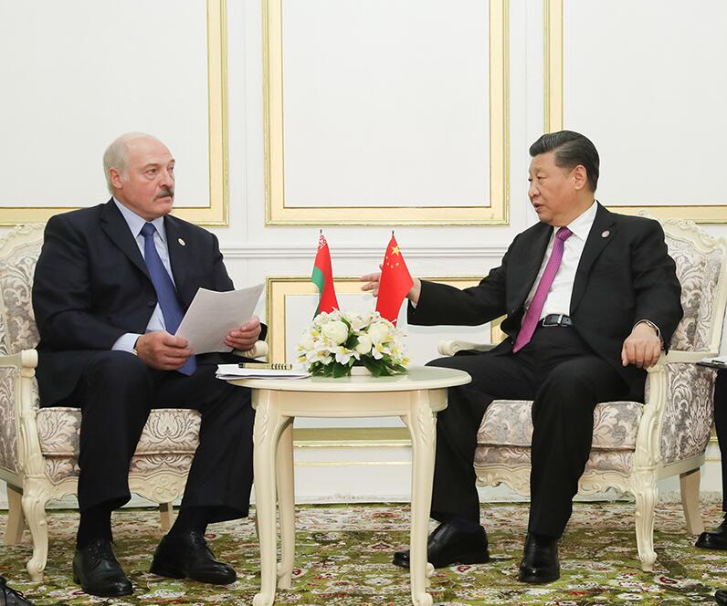 2019年6月14日,国家主席习近平在吉尔吉斯斯坦首都比什凯克会见白俄罗斯总统卢卡申科。新华社