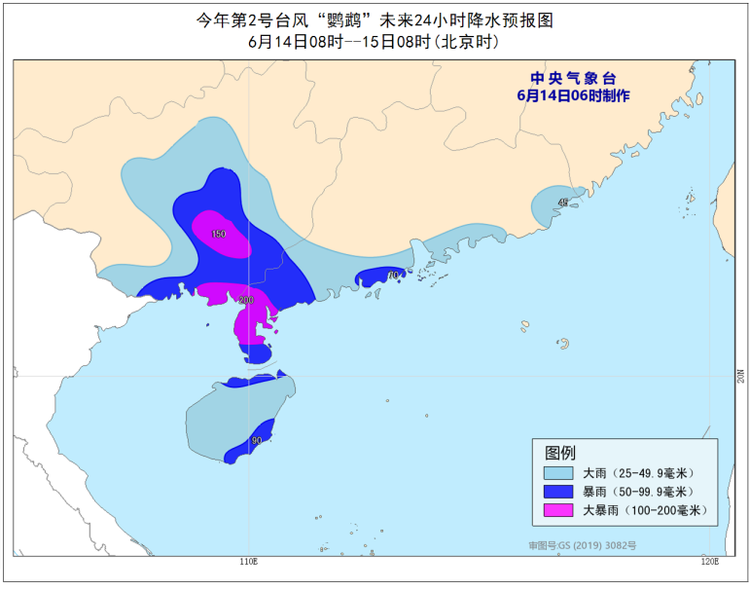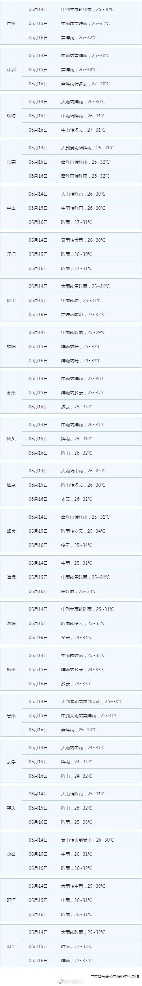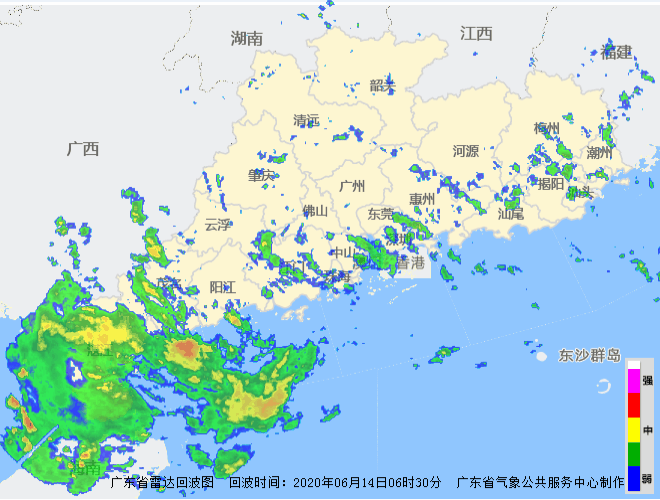 14日,湛江、茂名将有暴雨到大暴雨,阳江有大雨到暴雨,局地大暴雨,珠三角市县、云浮、汕尾有中到大雨局地暴雨,其余市县有雷阵雨;粤西和珠三角南部沿海市县有大风7~9级、阵风10~11级,14日夜间起,我省沿海和海面的风力减弱到5~6级。