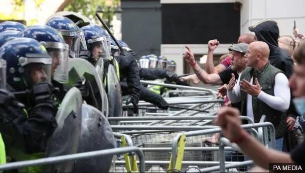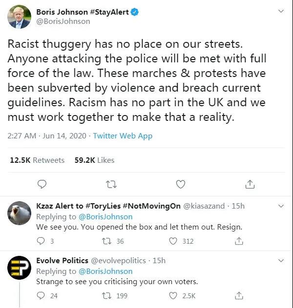 英国首相鲍里斯·约翰逊在推特上发文称,“种族主义的暴徒在这里没有市场,任何袭击警察的人都将受到法律严惩。游行和抗议活动已经被暴力和违反现行规则(的行为)所颠覆。”