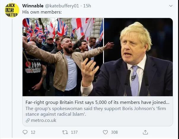 约翰逊这番说话却遭到嘲讽,有网民跟帖指责说:正是约翰逊本人打开了盒子,放这些极右种族分子出来。这位跟帖者还要求约翰逊辞职走人!