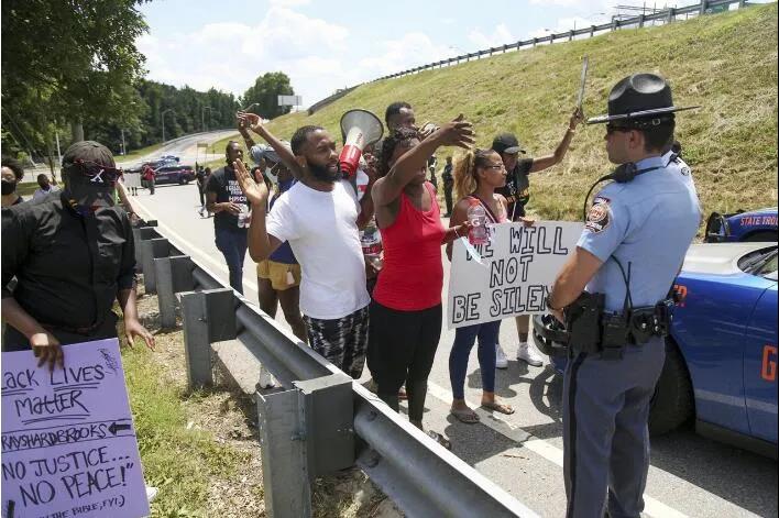 图为6月13日,亚特兰大警员阻止在高速公路上抗议的示威者。