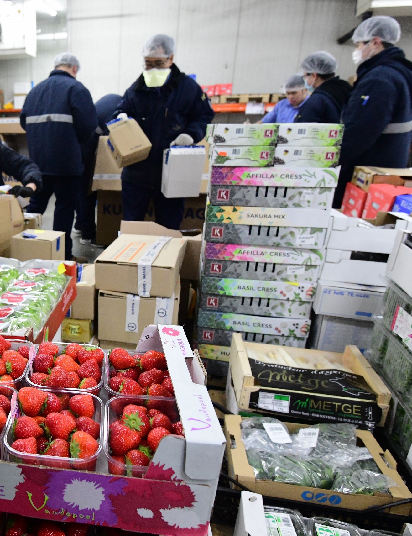貨倉每日早上8時營運至晚上8時,前一天由寫字樓同事開單,翌日貨倉同事按單出貨,李敬初說,每個月出單的數量多達3萬至4萬張,疫情下市況慘淡,每個月只有約2萬張訂單,大減近半。早上一架架貨車載着剛從機場清關回來的新鮮食材駛入大樓,按照貨運單有序接收物資,由工人逐箱拆貨、點貨、補貨,然後下午多架貨車駛出去到各大酒店、餐廳送貨,李敬初表示:「由飛機運送到貨倉,再送貨到顧客手上期間,都會因應各種食品而設置適當保存溫度,確保食物在最佳狀態。」相信讀者在餐廳進餐時,並沒有想過一件小小的進口牛扒,能夠成功運送到餐廳,背後原來藏着不少人的努力。
