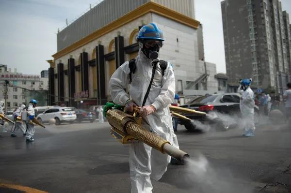 昨日,北京藍天救援隊在岳各莊批發市場開展消殺作業。新華社