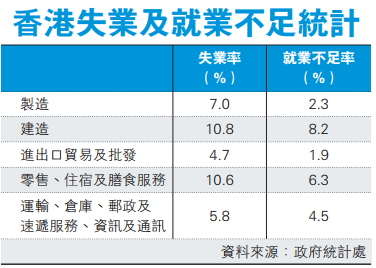 建造和製造業同樣是重災區。製造業失業率,由2至4月的6.2%,上升0.8個百分點至3月至5月的7%;建造業失業率則由2至4月的10%,上升0.8個百分點至3至5月的10.8%。