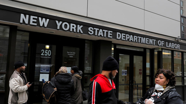 在紐約州勞工局外,人們等候入內查詢就業及失業救濟金事宜。 網絡圖片