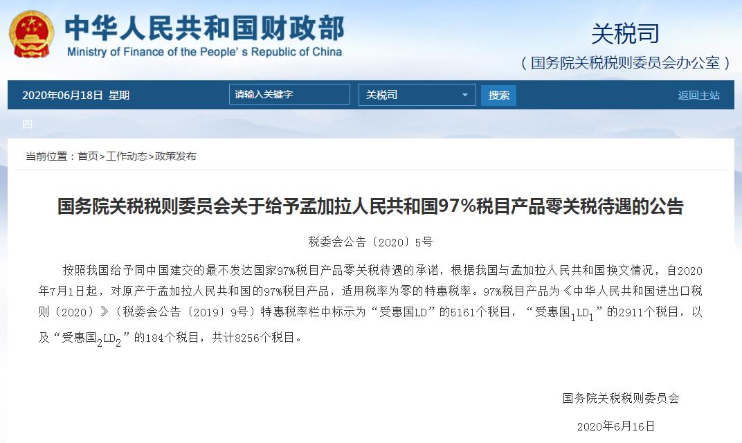 国务院关税税则委员会表示,按照我国给予同中国建交的最不发达国家97%税目产品零关税待遇的承诺,根据我国与孟加拉人民共和国换文情况,自2020年7月1日起,对原产于孟加拉人民共和国的97%税目产品,适用税率为零的特惠税率。97%税目产品共计8256个税目。