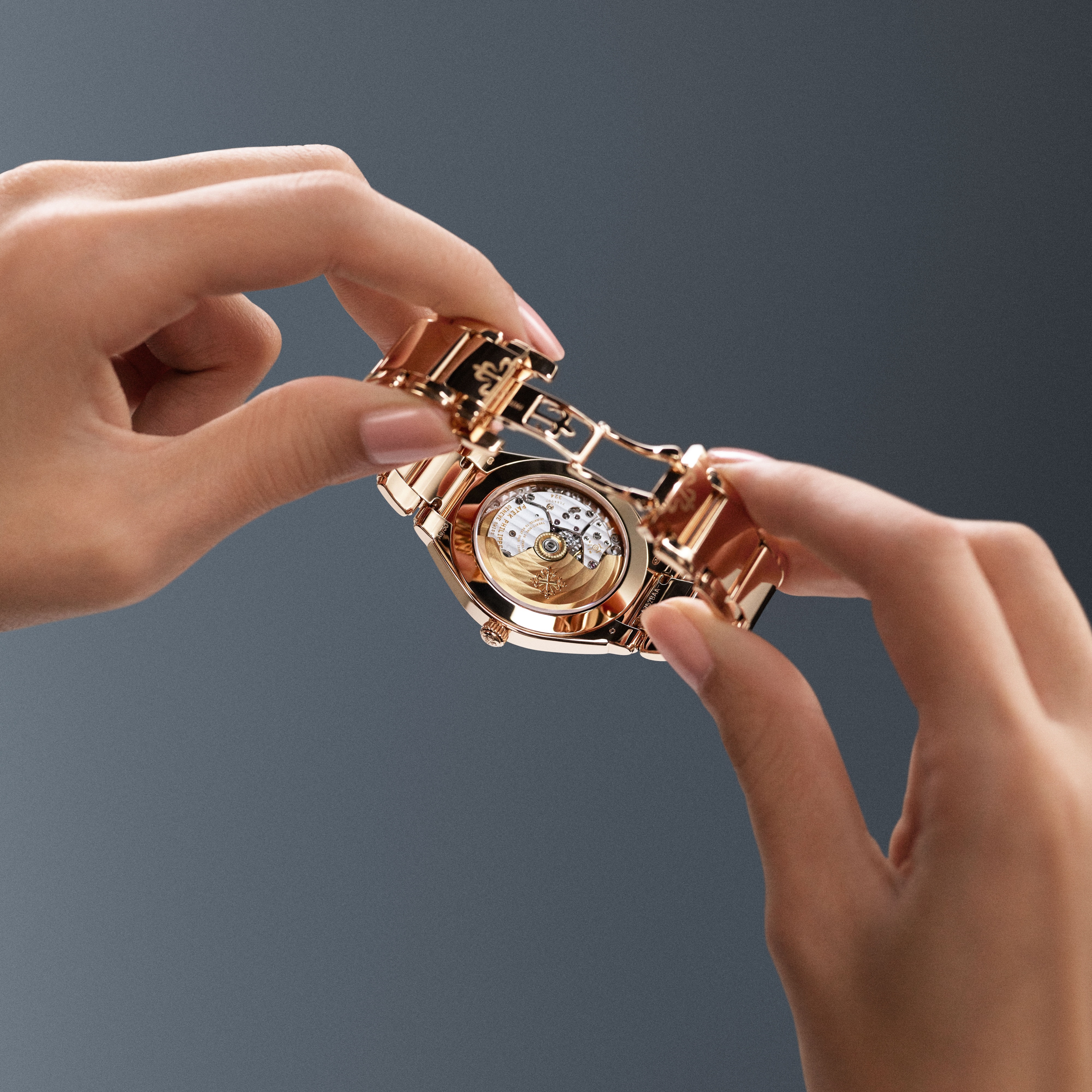 表鏈配備摺疊扣及接連扣,摺疊扣系統備有4枚獨立扣爪,令開合更穩妥,防止兩枚搭扣任何一枚意外鬆脫。寶石玻璃表殼底蓋展現324 S C自動上弦機芯的工藝細節,鐫刻上品牌印記。夾板橋上展現的削角邊緣及日內瓦條紋裝飾等,或是刻有卡勒卓華十字星的 21K金質擺動陀,皆雅致出眾。