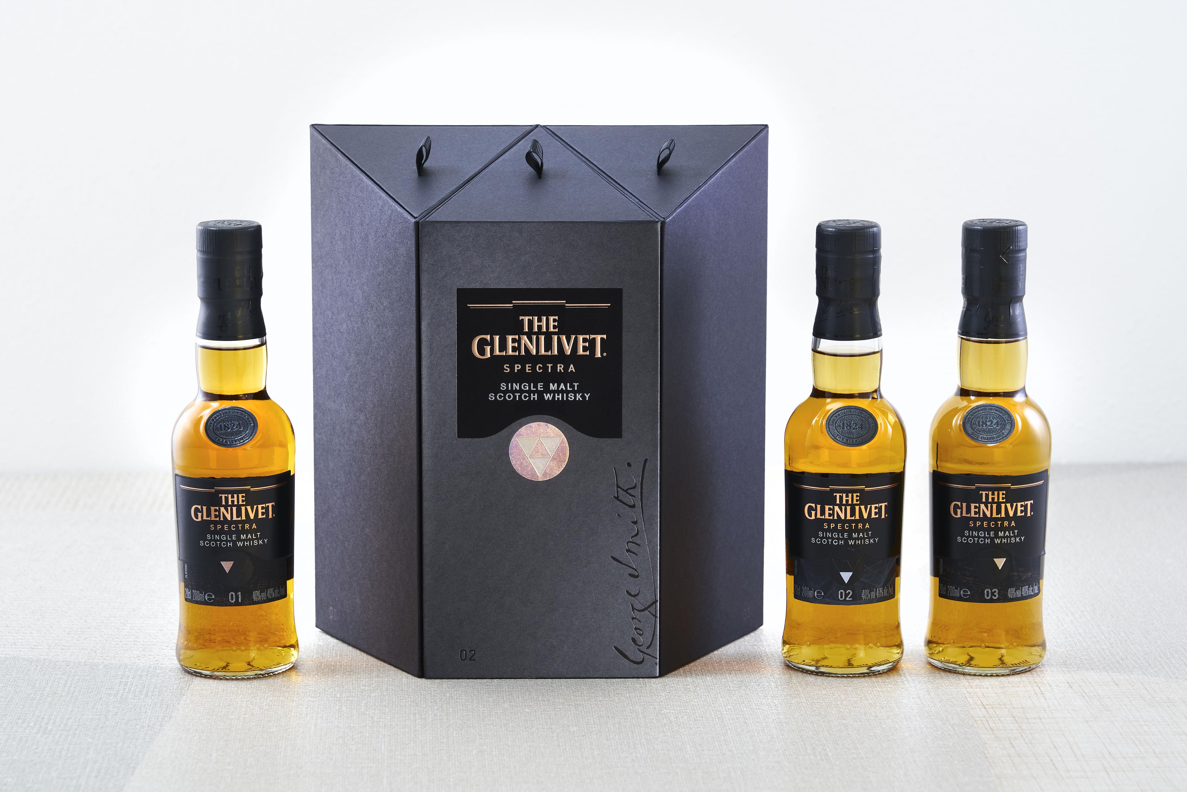 全球首間單一麥芽威士忌蘇格蘭酒廠The Glenlivet,最新推出的Spectra是一套三款的無標示威士忌,獨特之處是產品沿用品牌獨有的不透露木桶資料或品嘗的說明方式,挑戰品酒者的味蕾。三款威士忌各有獨特而分明的口感,每一款均貫徹順滑、果香豐富的風格,味道醇厚。酒品的包裝亦秉承品牌的大膽、前衛形象,由三個全啞黑色的三角柱盒組成,沉實且充滿神秘感,與天下父親的嚴肅形象互相匹配。