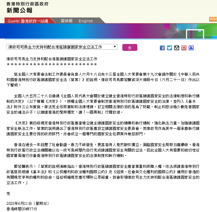 【香港商报网讯】就全國人大常委會法制工作委員會負責人六月十八日向十三屆全國人大常委會第十九次會議作關於《中華人民共和國香港特別行政區維護國家安全法(草案)》的說明,律政司司長鄭若驊資深大律師今日(六月二十一日)作出以下聲明: