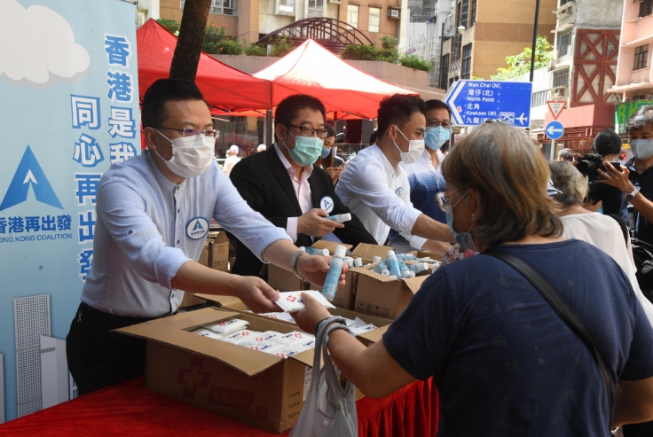 香港再出發大聯盟昨日於多區派搓手液,提醒市民不要鬆懈。記者 蔡啟文攝