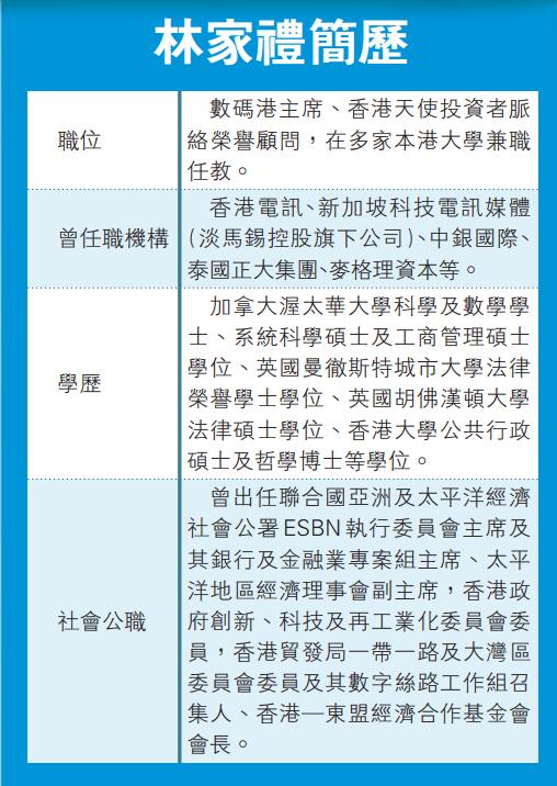 至於數碼港的擴建計劃有否受到新冠疫情影響,林家禮稱,園區擴建計劃非常平穩,一切不變。另有關數碼港園區的交通接駁問題,林家禮稱,期望見到計劃中的南港島線(西段)落實途經數碼港,不排除就此與政府商討。