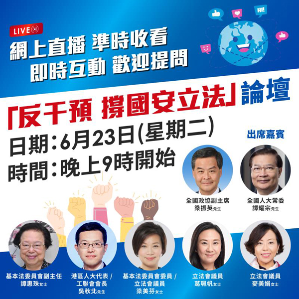 另外,「反幹預 撐國安立法」論壇將於今晚9時舉行,並設有網上直播,論壇還特別設置了即時互動環節,觀眾可以向出席嘉賓提出自己關心的問題。出席嘉賓包括全國政協副主席梁振英、全國人大常委譚耀宗、基本法委員會副主任譚惠珠、身兼港區人大代表的工聯會會長吳秋北、身兼基本法委員會委員的立法會議員梁美芬、以及另外兩名立法會議員葛珮帆和麥美娟。