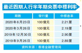 不過,相比2019年未有新冠肺炎襲全球,今次的投標成績不及去年。畢竟去年先後3次推出的半年期央票,息率皆創新高,如去年12月30日推出時,最高接納息率為2.9厘,較去年9月26日的2.89厘為高。而首次面世的同期央票是去年6月26日,當時也是推100億,中標息率為2.82厘。