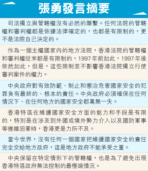張勇表示,香港法院的管轄權和審判權從來都是有限制的。