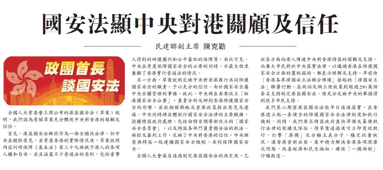 全國人大常委會上周公布的港區國安法(草案)說明,我們認為有關草案充分體現中央對香港的關顧及信任。