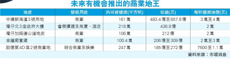 港府下季還將推售另一幅商業地,即東涌商業用地,是東涌東填海區首幅推出市場的用地,可提供約11.7萬平方米樓面面積。黃偉綸表示,該兩幅商業地的推售,反映政府在涉及近岸填海的造地工作漸見成果。美聯測量師行稱,非核心區商業地需求未見殷切,預期東涌商業用地入標反應只屬一般,估值逾50億元。吳庭琛表示,該填海地偏離港鐵站,附近亦未有商業地,配套或未夠完善,料每呎樓面地價4000元。