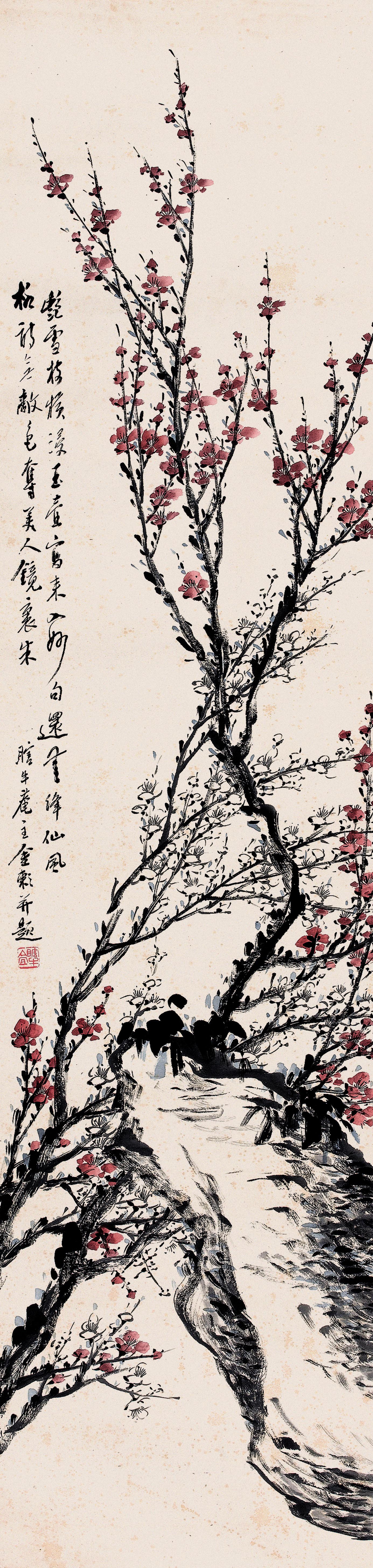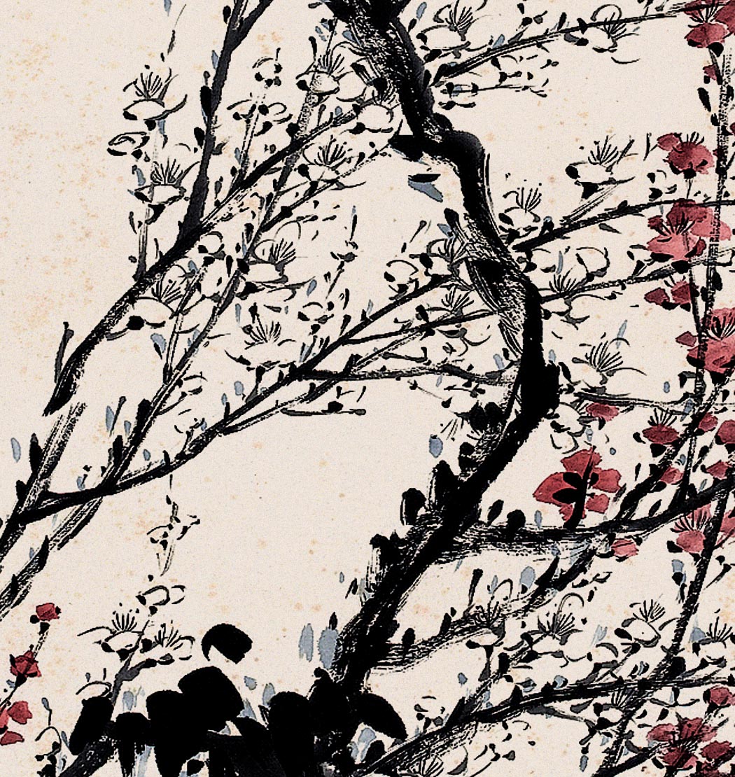 此畫構圖優美,穩重中寓有變化。紅梅與白梅交錯參差,交相輝映,長短對比,主次分明。紅梅以深淺不同的紅色色塊點成,白梅由墨筆圈畫。梅枝以乾澀不同的水墨皴擦點染,蒼勁有力,頓挫轉折處帶韌勁,疏而不散,密而不亂,穿插有致,粗細相間,老幹新枝自由舒展,畫面充實和諧。右下角以石塊的重量感穩定構圖,平衡了梅枝從左邊傾斜向上伸展的畫面,左側長題七言詩,使整個畫面更為飽滿協調。