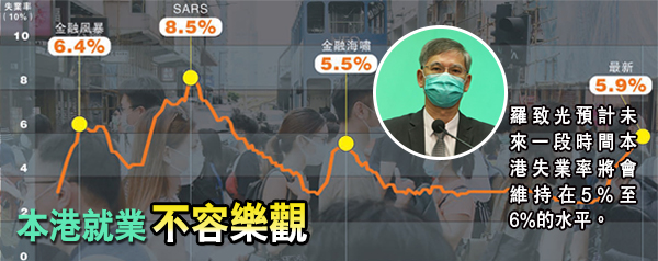 羅致光直言,在1997年上半年,香港的失業率低於3%或以下,屬於全民就業的水平。但香港其後經歷了亞洲金融風暴、沙士與金融海嘯,直至2017年,失業率才重返3%或以下的全民就業水平,可見恢復時間相當長。他認為今次全球受新冠肺炎疫情的影響,可能會更深、更遠,所以特區政府只能維持一個非常謹慎的態度去看經濟和就業情況,因此預計未來一段時間,本港失業率會維持5%至6%的水平,不會在短時間內下降,而他亦相信7月公布的4至6月平均失業率將會超過6%。