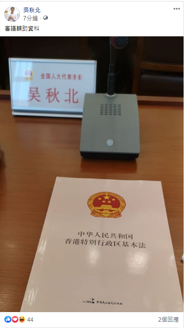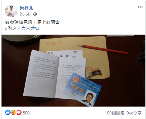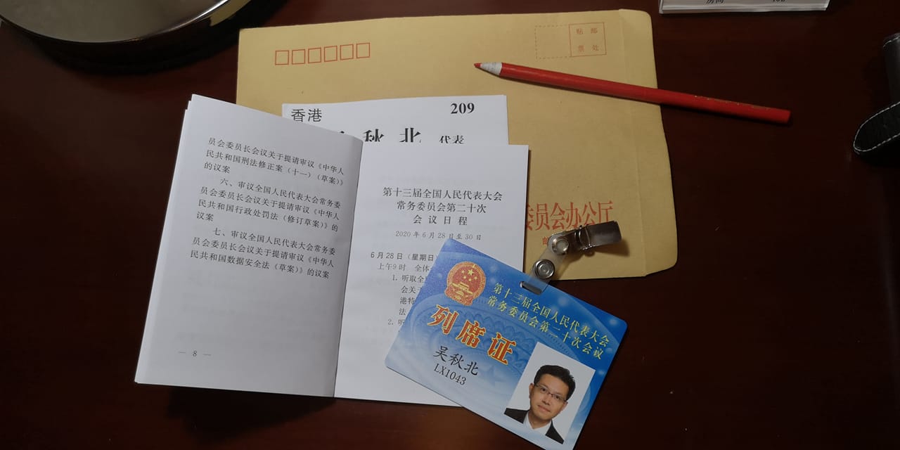 有份列席的港區人大代表吳秋北,今早在社交網站貼出列席證和部分會議日程,顯示今日首項議程的部分字眼包括「港特」。吳秋北在帖文指,參與建議見證,馬上就開會。