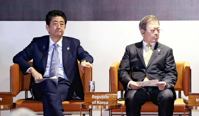 安倍與文在寅。資料圖片