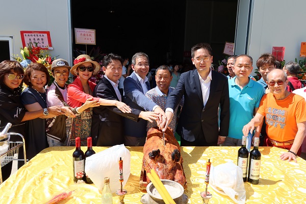 香港商務及經濟發展局副局長陳百里(右三)、生產力促進局總經理葛明博士(右二)、黃特平(右四)齊齊切燒豬慶祝工廠開幕。