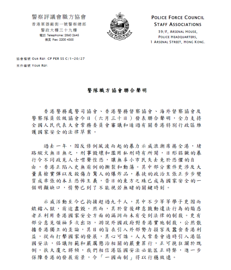 香港警務處警司協會、香港警務督察協會、海外督察協會及警察隊員佐級協會發表聯合聲明,全力支持全國人民代表大會常務委員會審議和通過有關香港特別行政區維護國家安全的法律草案。