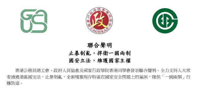 香港公務員總工會、政府人員協會及國家行政學院香港同學會今日發表聯合聲明,全力支持全國人大常委會通過港區國安法,止暴制亂,全面堵塞現存特區在國家安全問題上的漏洞,確保「一國兩制」行穩致遠。