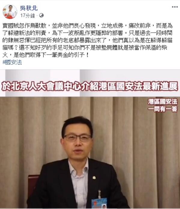 吳秋北表示,過去一段時間見到香港的賣國賊、暴亂分子等忽作鳥獸散,有的更揚言退出江湖,證明「港區國安法」有作用,起到震懾的作用。他指,事實上,並非賣國賊、暴亂分子等的良心發現,痛改前非,而是為了躲避新法的刑責,為下一波叛亂作更隱弊的部署。