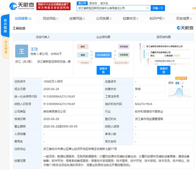 【香港商报网讯】据天眼查数据显示,6月28日,浙江省新型互联网交换中心有限责任公司成立。该公司注册资本1亿人民币,法定代表人是王顶,公司经营范围包括数据处理服务;互联网数据服务;计算机软硬件及辅助设备批发;计算机软硬件及辅助设备零售;通信设备销售;软件开发;信息系统集成服务;信息技术咨询服务等。