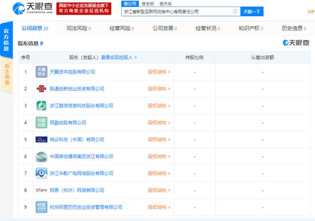 天眼查股东信息显示,该公司共有9大股东,其中,网易(杭州)网络有限公司,联通创新创业投资有限公司、中国移动通信集团浙江有限公司、杭州阿里巴巴创业投资管理有限公司等均在股东行列。
