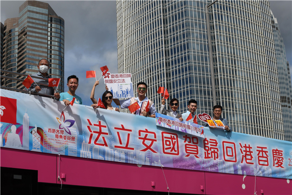 其後,多位嘉賓分別登上4輛花車巡遊香港各處,由中環出發途經上環、西環、華富至西灣河結束,每到各處都有大批市民夾道歡呼,揮舞國旗與區旗,花車不時停下來播放愛國歌曲,市民爭相上前拍照。