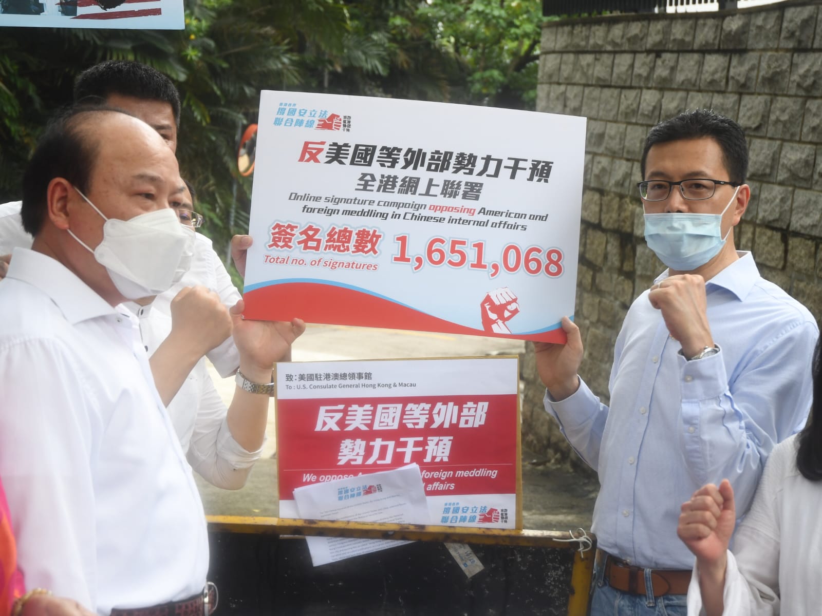 【香港商报网讯】記者馮煒強報道:今天上午,「香港各界撑国安联合阵线」到美国驻港总领事馆请愿,并递交市民联署反对美国干预香港事务的电子签名,阵线公布已获超过165万人联署。