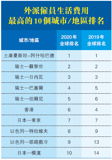 ECA調查指出,香港在全球外派僱員生活費用最高昂城市的排名中跌出首五位,排名第六,但仍明顯高於其他亞洲熱門城市。ECA International亞洲區域總監關禮廉表示,去年香港社會政治動蕩,加上新冠肺炎疫情,影響部分僱員的來港意願。