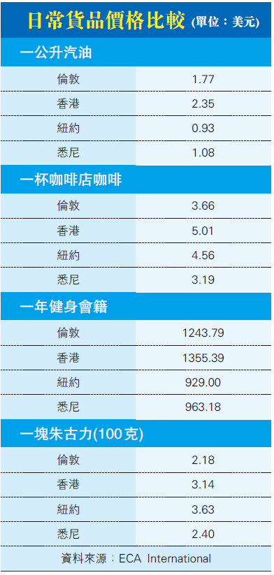 另外,以一杯咖啡為例,香港要5.01元可買到,紐約需4.56元,倫敦要3.66元,而悉尼只需3.19元。至於健身會籍方面,在香港一年的費用是1355.39元,倫敦要1243.79元,悉尼是963.18元,而紐約僅需929元。