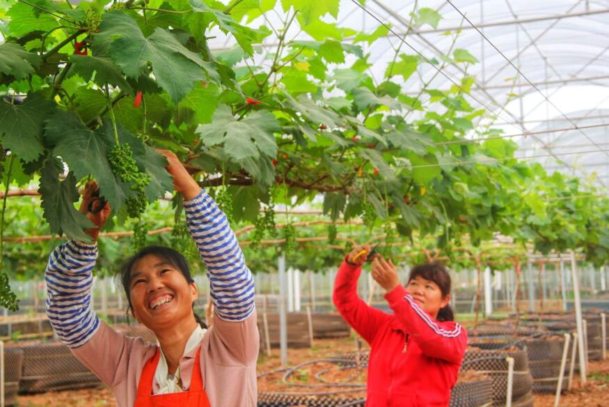 南雄市陽光玫瑰葡萄園現代農業產業園內,果農正在蔬果(賴信英攝)