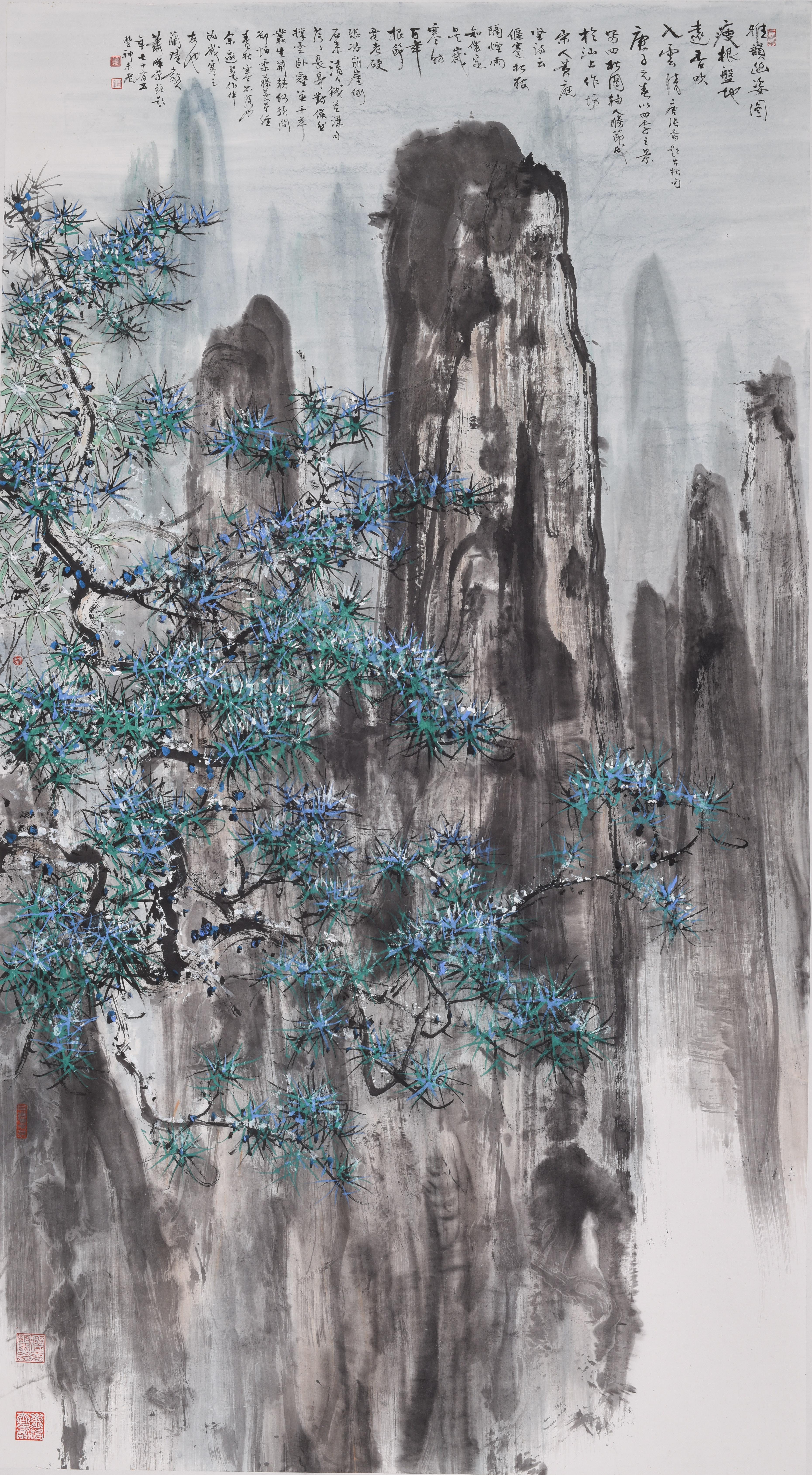 蕭暉榮的《秋光翠色圖》繪畫出松樹傲立風霜中的高亢不阿精神面貌。古幹屈折盤旋、回互交織,如巨臂遮天,挺拔剛毅,轉角強拗硬扳,勢如屈鐵;樹枝橫勁彈進,雄肆拙樸,宛若銅鑄;針葉瘦勁,鋒利秀挺,活潑靈動。畫家以遒勁凝練的線條勾勒松樹的形質,以乾濃墨色和群青點出古節老鱗,疏密有度,情氣並盛,筆力剛勁宛如「高山墜石」,松樹蒼勁偉岸的神韻躍然紙上。中景的山峰削壁用淡墨皴擦,赭石渲染,重岩相扣,特顯質感;用花青薄染的遠山,奇峰相迭,有高秀雄奇之勢,極具層次和縱深感。峭拔剛勁的山峰和凌霜傲然的蒼松,正正是畫家高尚風骨與不屈氣節之寫照。