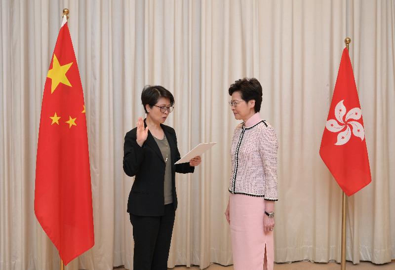 警務處副處長(國家安全)劉賜蕙(左)7月3日在行政長官林鄭月娥(右)監誓下宣誓就任。政府新聞處圖片