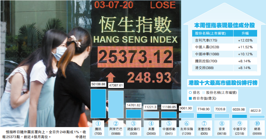 恒指昨日隨外圍反覆向上,早上高開195點後升幅擴大,午後曾升329點一度高見25453點,全日升248點或1%,收25373點,創近4個月高位。國指升186點或1.9%,收10243點。恒指本周累升823點或3.4%,國指本周累升390點或4%。