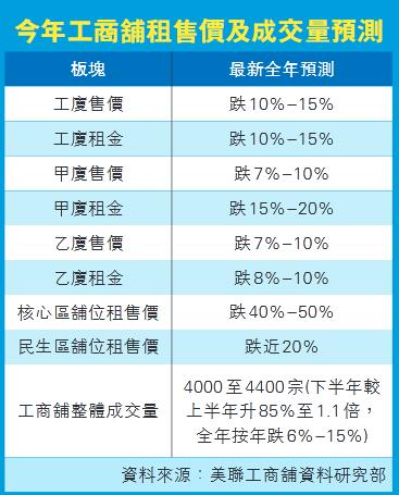 展望後市,翁鴻祥預計,下半年商廈租售價將先跌後升,當中分散業權甲廈租售價由於跌幅較大(尤其中區一帶),惟低基數下,後市反彈也將較大,總計下半年走勢料平穩至微升,全年售價上調至僅跌7%至10%,租金維持跌15%至20%。他估計乙廈波幅較細,加上預期不少銀座式商廈業主改回作寫字樓用途,但在供應增加下,乙廈租售價反彈力度將不及甲廈。