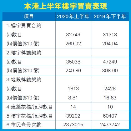 另外,上半年樓宇轉讓契約共35038份,較去年下半年度下跌25.8%,與去年同期比較亦下跌21.5%;總值2498.6億元,較去年下半年度下跌37.2%,與去年同期比較亦下跌31.9%。