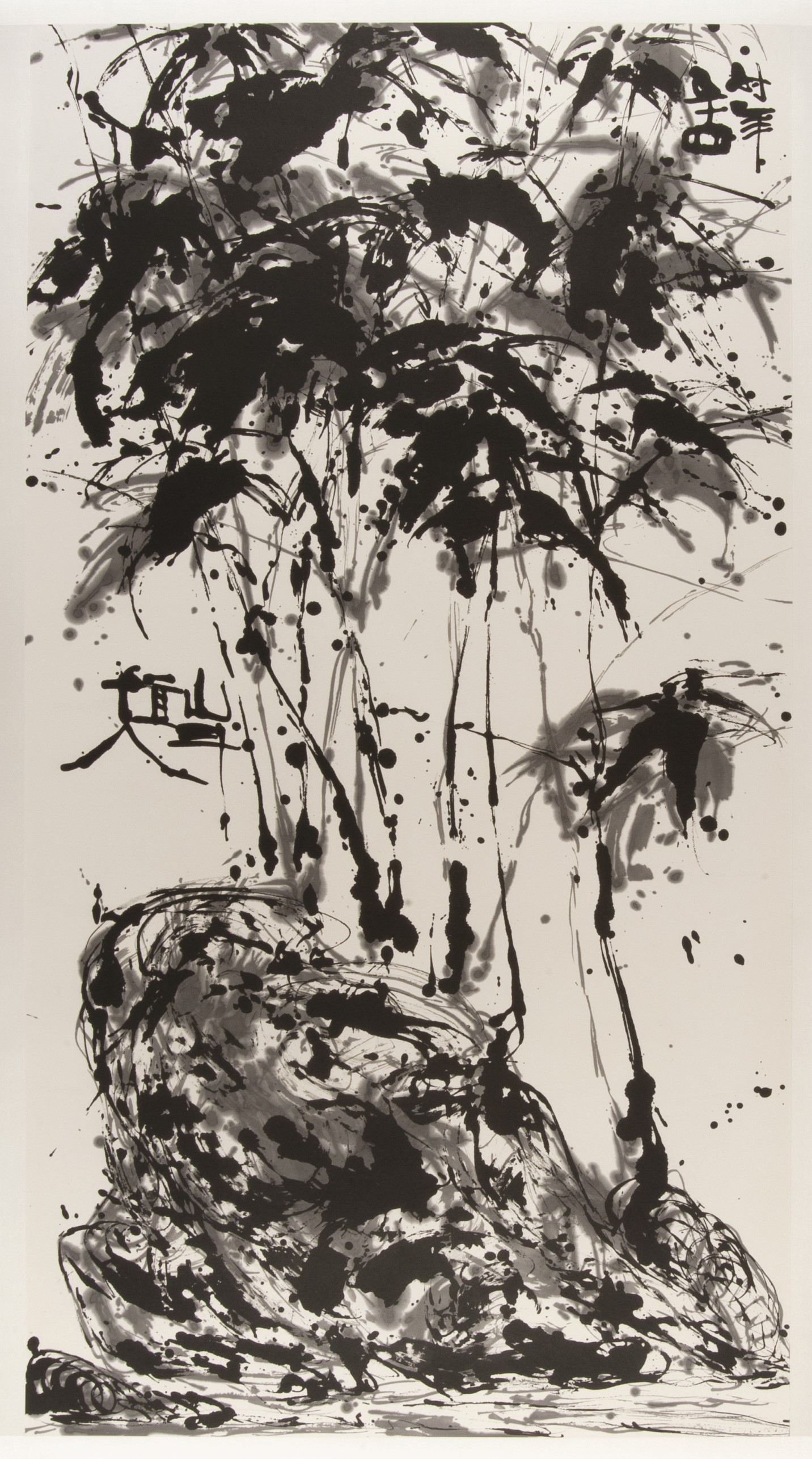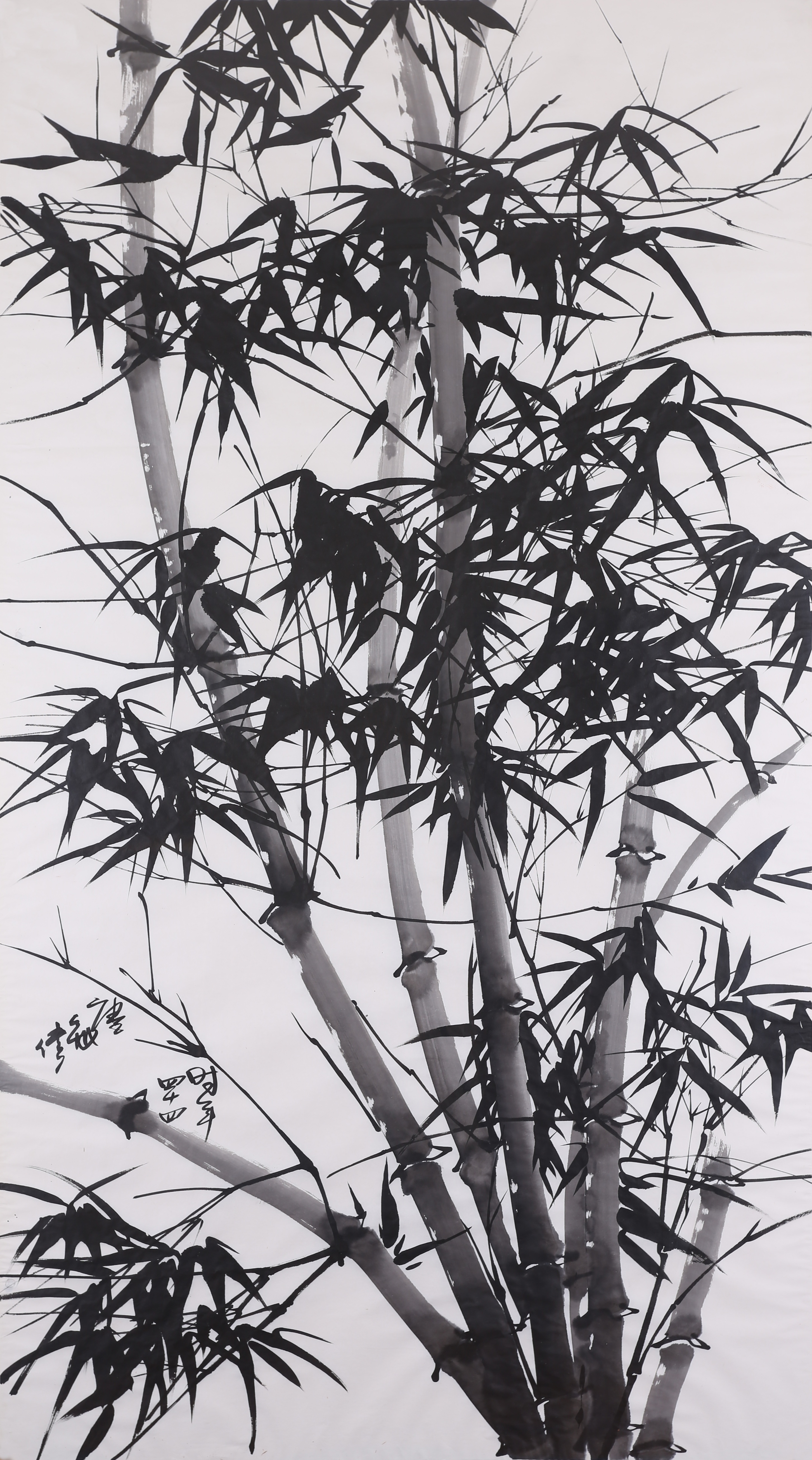 一生醉心水墨的唐家偉,專注於創作,像「筆觸的形態」、如何運筆和施墨或許是不少藝術家經常思考的問題,他反而棄用畫筆,最後的10年用「指畫」創作,即使用手指、指甲揮毫於紙上。「儘管他不是唯一一位棄用畫筆的畫家,但其作品中展現的文化意義相當重要。」羅諾德認為,在唐氏的作品中,用墨、着色、構圖和留白的把控無一不彰顯傳統國畫的精髓及他的掌握能力,「他從畫筆到手指作畫是漸進式進行,從其作品可見,他詮釋傳統國畫筆墨,絕不是用手還原傳統畫筆這麼簡單。」展品八呎高的《靈山9》及約6呎高的《竹4》,兩幅展品皆為「指畫」。羅諾德向筆者介紹,《靈山9》是他覺得最震撼人心的展品,「它是本次展覽中尺幅最大的展品,這幅以手指及指甲描繪而成的大型山水畫,是唐氏藝術生涯的巔峰之作。」乍看之下,與一般以畫筆繪畫的山水畫沒有哪些不同,墨彩均勻地躍然紙上,只有近距離仔細觀看,才能發現手指移動的路線、指甲刻畫的精細線條,呈現出畫家的精湛技巧。用點、線組合成的雲霧、山的輪廓等,在畫布上流動,充滿動感,或許唐家偉想將藝術予他的活力傳遞給觀者。