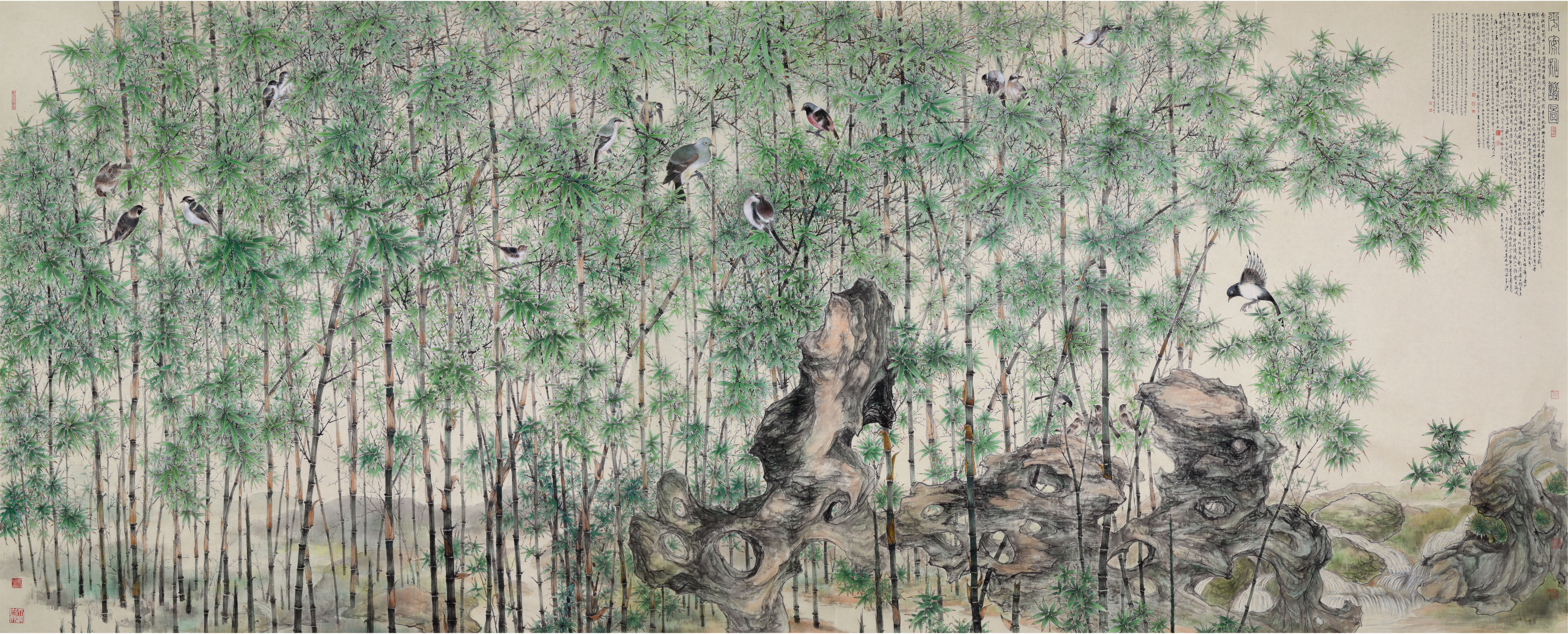作於丈六匹白絹上的《平安和諧圖》是蕭暉榮繪畫竹題材的經典之作。此巨製描寫一片清幽的山澗間,叢竹林立,竹竿修長,翠葉繁茂,靈禽歡聚,奇石屹立,泉水涓涓,一派春意盎然之平安和諧景色。工整又極具筆墨意趣的繪畫,配上鳥蟲篆書畫題和逾千字行書長跋,充分展現作者高超的書畫藝術造詣。