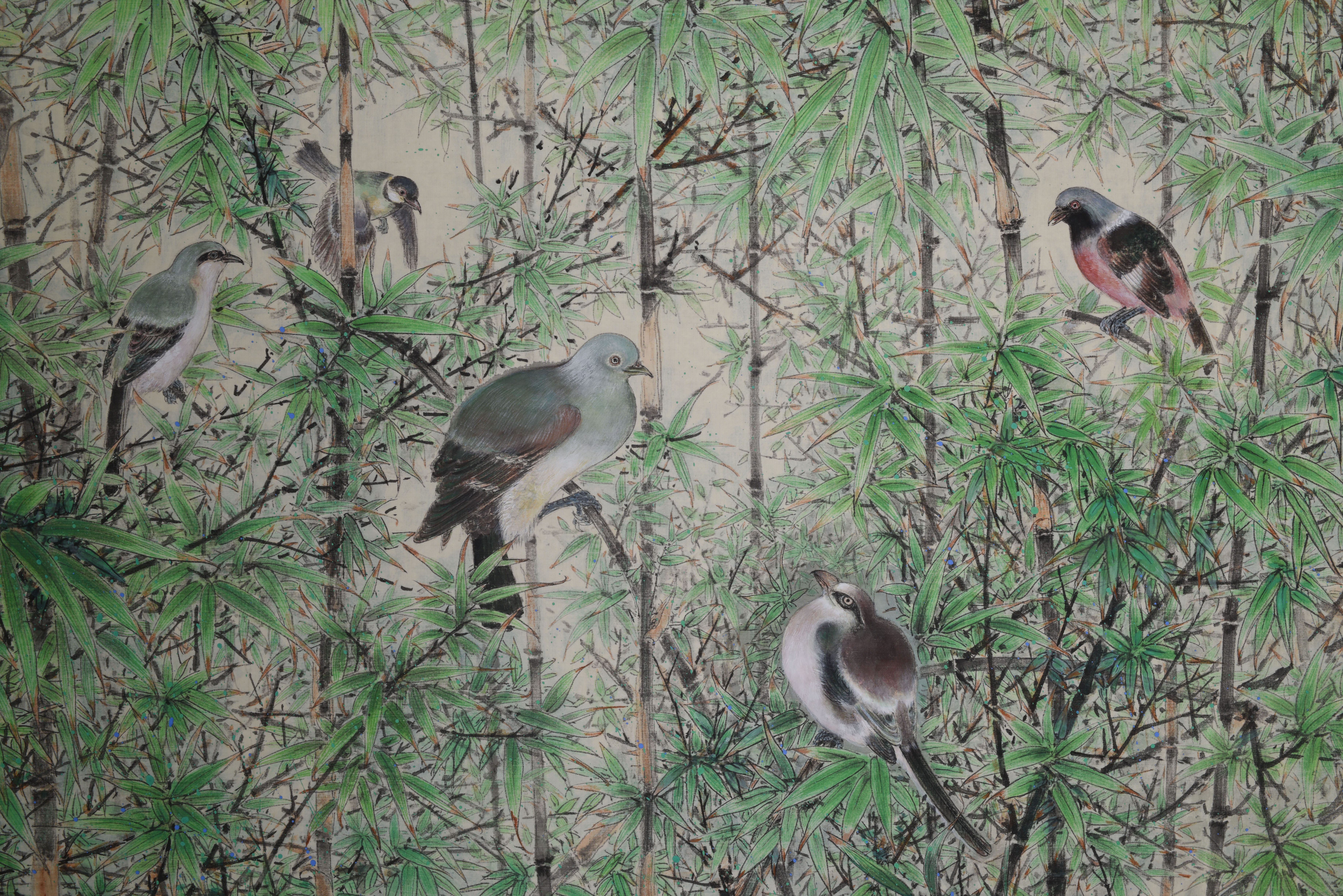 畫中修竹重重,枝幹挺勁,竹節竹殼竹筍描寫細膩;竹葉疊疊,青翠茂盛,向背俯仰交錯,層次豐富,極具空間感和視覺衝擊力。雙鉤線條細勁,敷色變化靈動,洋溢着新篁勃發之秀勁瀟灑韻味。二十隻造型逼真的禽鳥皆形神俱足,或結伴閒聊,或相對鳴唱,或悠然獨思,無不維妙維肖,栩栩如生,為平靜的竹林增添了無限動感。清脆的鳥鳴伴着淙淙流水,構成了一篇飽滿悅耳的樂章,令人心曠神怡,流連忘返。