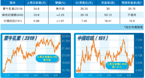 同為乳業股的蒙牛近日獲多間大行唱好,上周四、五股價曾連續兩日升幅超6%,上周五股價更高見35.45元,創本身上市新高。雖然蒙牛乳業上月發布盈警稱,預期上半年度純利按年下降45%至60%,但仍然無阻其股價繼續探頂。