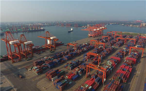 一批外貿集裝箱在江蘇連雲港集裝箱碼頭裝船。 新華社
