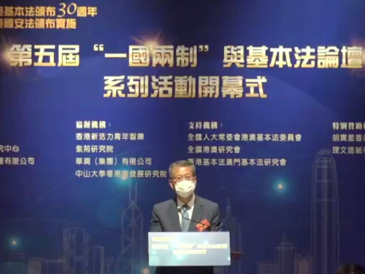 陳茂波於開幕式致辭表示,在「一國」之內有「兩制」的運作是創新的思維,沒先例可援;在社會主義國家、兼容着資本主義城市,一國之內兼具兩種制度,是國家的重要制度優勢之一,要這樣有特色的體系有效運作、與時並進,並且適應社會變遷,是實存的挑戰;要成功,前提是須從制度上、法律上、運作上,釐清定位、責任和義務,建立相關機制並且不斷完善,讓它即使面對環境變化,仍可有序運作,從「一國」到「兩制」、從憲法到基本法、從國家安全到香港國安法都是這樣發展。有「一國」、才有「兩制」;有憲法、才有基本法。要妥善保障國家安全,香港必須避免被利用為顛覆、分裂國家的前哨陣地,故特區政府從香港國安法決定立法以來一直強調,堵塞法律漏洞,鞏固國家安全是「一國兩制」行穩致遠的基石。