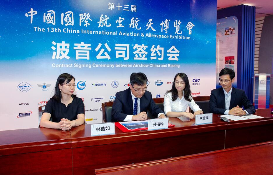 珠海航展有限公司董事長兼總經理孫潔峰與波音民用航空市場銷售中國區副總裁高思翔代表雙方進行了簽約。本屆航展,波音公司室內參展面積將達300平方米,創近10年參展面積新高,這標誌着波音公司將以全新規模亮相本屆航展。