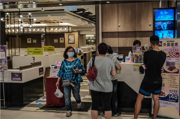 晚市禁堂食,不少市民在傍晚6時後到餐廳購買外賣,餐廳貼出告示及圍封堂食用餐區。 中通社