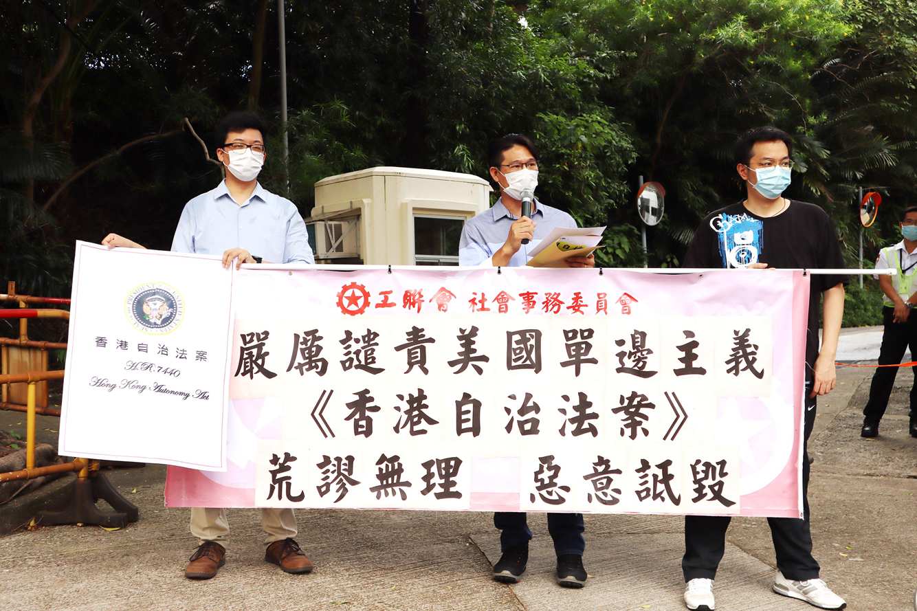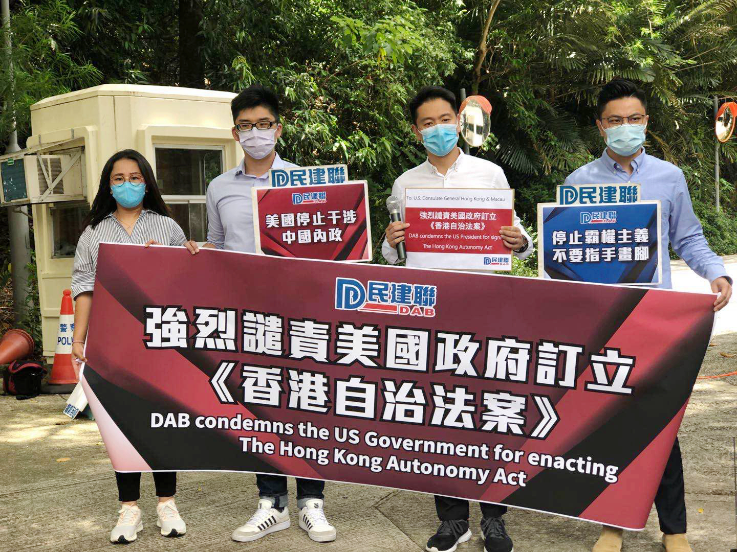 此外,多個政團昨日前往美國駐港澳總領事館抗議。其中,民建聯立法會議員周浩鼎及一批成員在美領館門外高聲指責美方公然干預中國內政和香港內部事務,抹黑香港國安法並散播恐慌,又指美國改變香港關稅地位的行為是「損人損己」,亦會影響美國向香港收取的貿易稅,損害自身利益。工聯會社會事務委員會發言人梁子穎在美領館外抗議後稱,美國自行訂定所謂的「香港自治法」粗暴干涉中國內政,惡意挑釁香港國安法,刻意扭曲香港的憲制地位,工聯會嚴厲譴責美國威脅制裁香港的可恥偽善行徑。